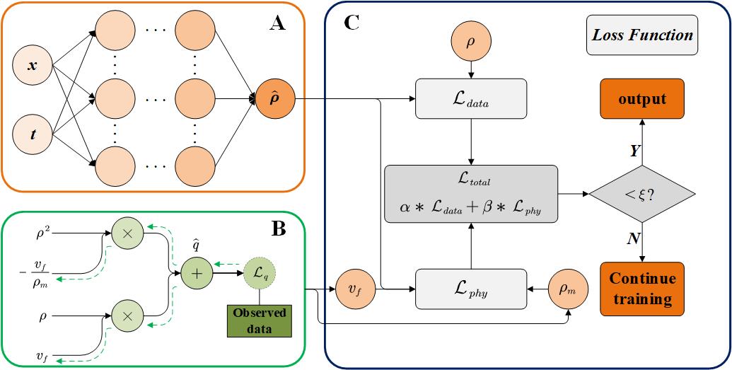 在国家自然科学基金基础科学中心项目、杰出青年基金项目、优秀青年基金项目和青年基金项目(批准号:72288101, 71825004, 72122003, 72201029)资助下,北京交通大学系统科学学院高自友教授团队针对稀疏数据场景下的道路交通状态估计问题开展研究,设计了基于物理信息深度学习(Physics-informed deep learning, PIDL)的交通状态(速度和密度)估计框架。该成果以“Physics-informed deep learning for traffic state estimation based on the traffic flow model and computational graph method”为题,于2023年发表在《Information Fusion》期刊上,论文链接: 。