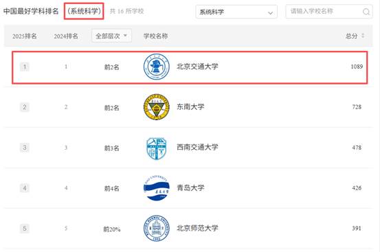 2025年10月15日,2025软科中国最好学科排名结果发布。北京交通大学系统科学继续稳居榜首,获评“中国顶尖学科”。